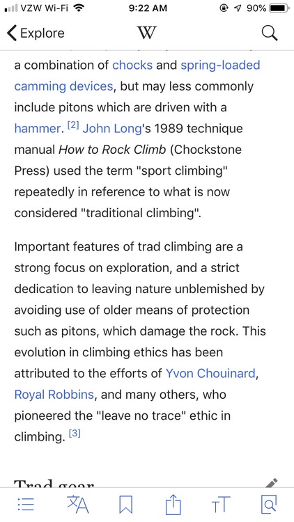 Meanwhile, a lack of a clear idea of the defining characteristics of trad climbing makes many of the arguments an exercise in non-sequitors.