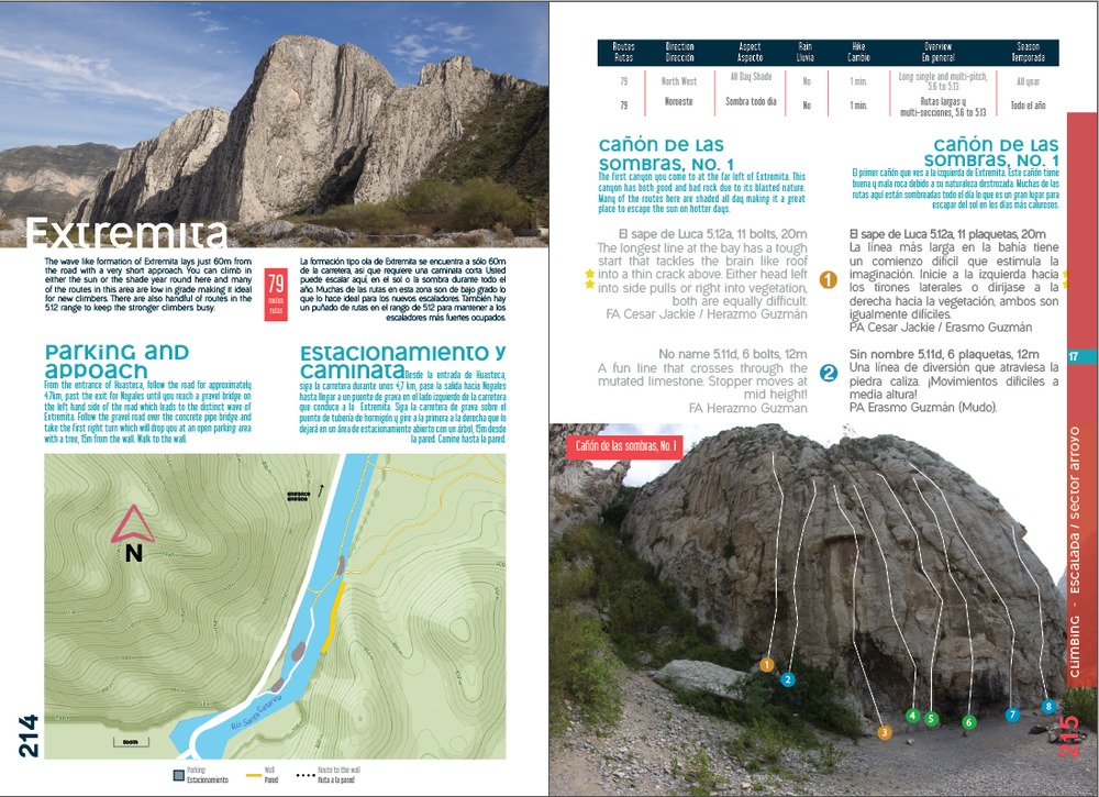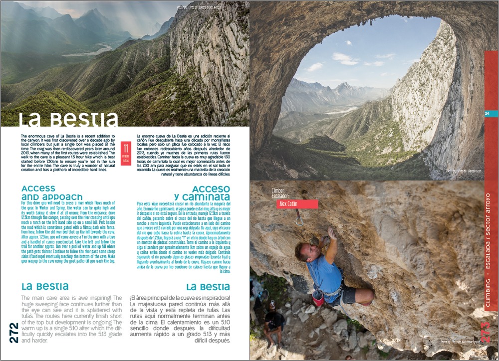 David, the approaches in La Huasteca range from the roadside to around 1 hour 30 minutes depending on the wall. The large majority are less than 5 minutes from the car with the exception of La Bestia (huge tufa cave with routes from 5.12 to 5.14+, many open projects), Virgincita (another cave with routes from 5.10 to 5.14+), Pico Independencia (300m+ sport multi-pitch) and Abuelo Fuego (500m sport and mixed routes from 5.10 to 5.12d).