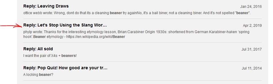 Anonymous wrote: 303 posts talking about "beaner." Most are either about this route or what appears to be misspellings of "biner" (they appear in a climbing context i.e./e.g. "does anyone know what kind of locking beaner this is?") 303 references overall, 239 in forum posts. 16th entry in the forum post list - a reply on page 3 of the 11 page thread. Search and clicking took all of 7 seconds. |