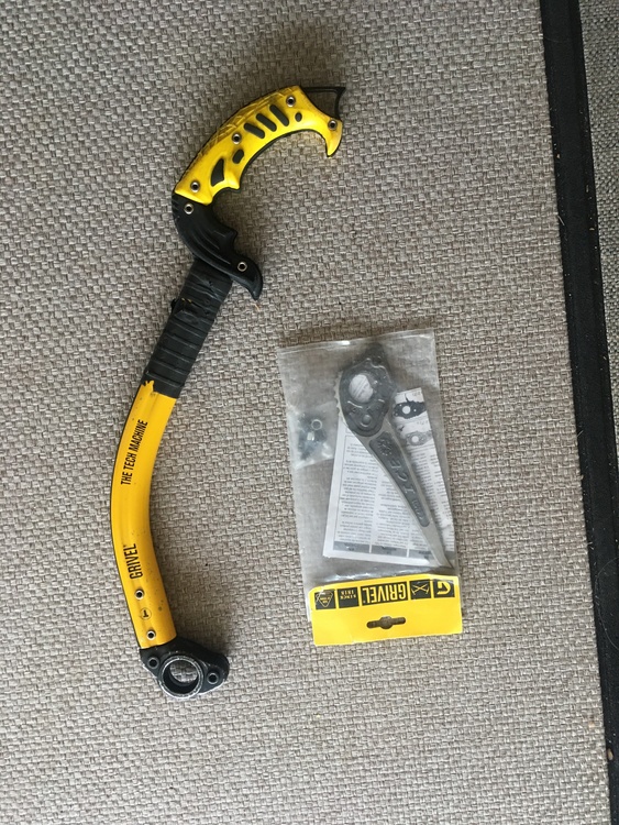BD rope bucket $15Mammut El Cap helmet, new $45BD Micro stoppers, new set $45Grivel Tech Machine, single tool, shaft only $100, has new bolts and nuts.Ice pick for Grivel Machine $40.