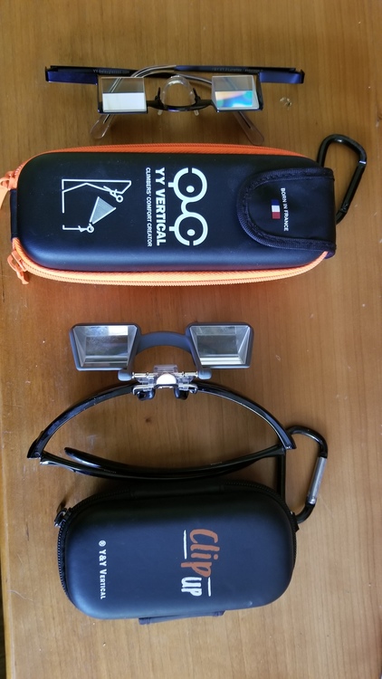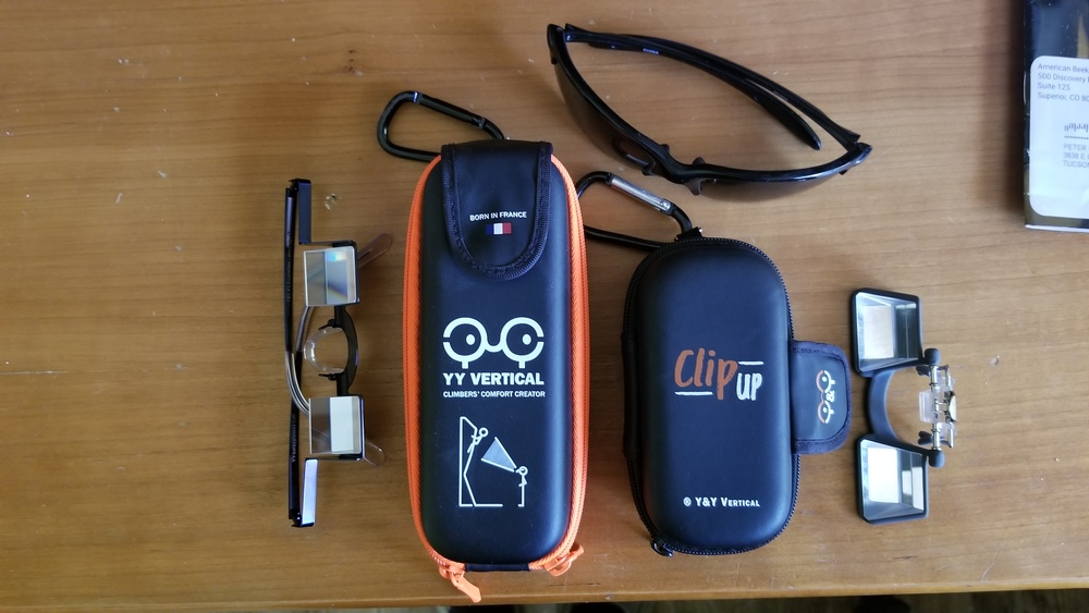 I have been pretty keen on the Y&Y clip ups. They flip up out of the way when you don't want to look through them and are more compact than other version. Only problem is that the attachment clip to clip to your sunglasses or prescription glasses only accommodates a thin junction between top of lens or nose piece and the lens on the sunglasses or prescription glasses. This is not a problem for prescription glasses as few have a large junction, but many sunglasses have thick plastic across the top of the glasses and the attachment clip won't accommodate that and doesn't seem to accommodate being bent (part of clip is plastic and can't be bent, the metal part of clip seems like it would break if you tried to bent it). I inquired with Y&Y if I could bend them or otherwise accomodate my regular sunglasses and they just said they were built for prescription glasses. I have a decent pair of sunglesses with thin junction, so I just climb with those. I rarely climb with my prescription glasses on, but the clip up fits fine on those.
