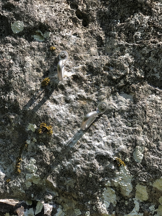 I upgraded the bolts on "Just another pretty Face" at the Lower Meadow couple of weeks ago. 100 % hole re-use. I would not choose that spacing for side to side, but its been ok for 30 years so I guess its ok. The sandstone is quite good at the meadow. BTW the protection bolts are all glue ins. I used stainless five piece for the anchor to help do the rest of the work. Those biners are long relative to a ring or something else. A real advantage on a side by side. |