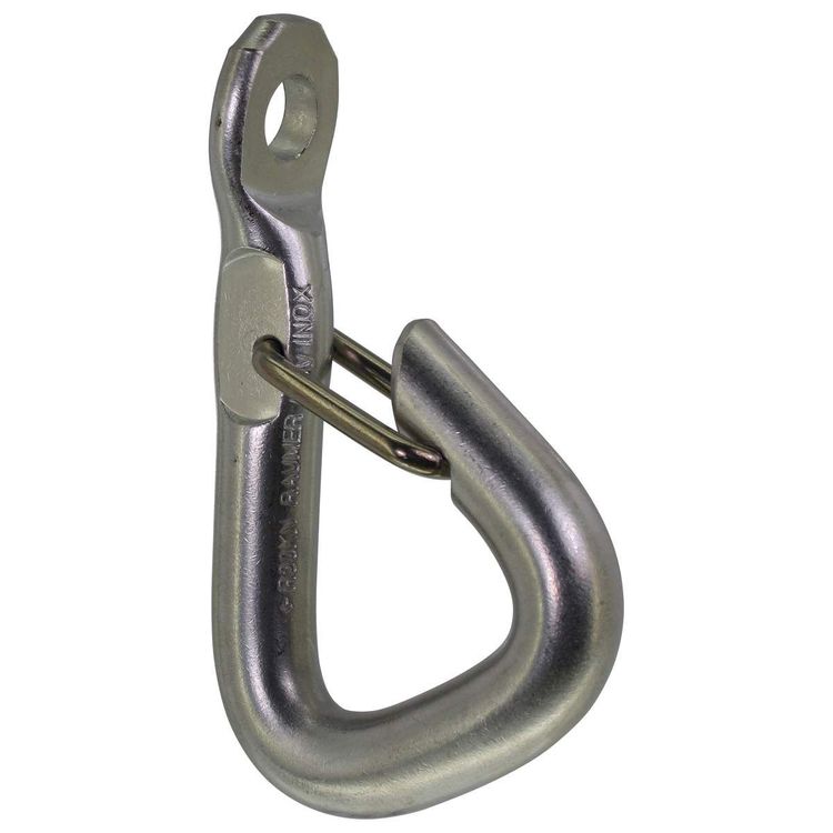 These are nice and 316ss with wire gate. https://team-tough.com/10-mm-closed-eye-wire-gate-carabiners And rams horn (pig tail) is another option, with no moving parts. |