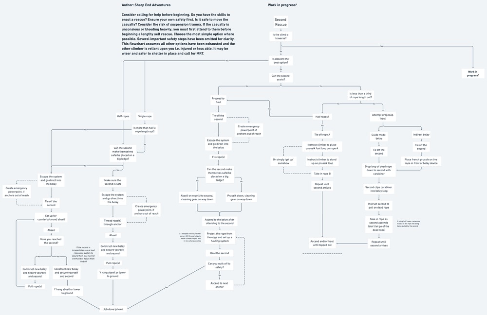 Short Fall Seanwrote: Yeah for sure, but what I mean is that I'd hope to be climbing with someone who doesn't need to consult a flow chart to know things like that and who excels at thinking on his feet. I get that. But at least in my experience, work flow documents are pre-action study guides or autopsy analysis tools rather than "use this when the issue arises" documents. Or to put it another way: I def don't want to be climbing with a partner that brings along an entire self rescue book with the intent to refer to it once I'm hanging lifeless at the end of the rope, but, I'd hope that my partner owns the book and has read through it prior to the climb. In the same vein, I'm not going to eschew the existence of self rescue books based upon the outlier possibility of someone referring to it on a route during an emergency since the assumption is that they're used for understanding prior to or after the event.