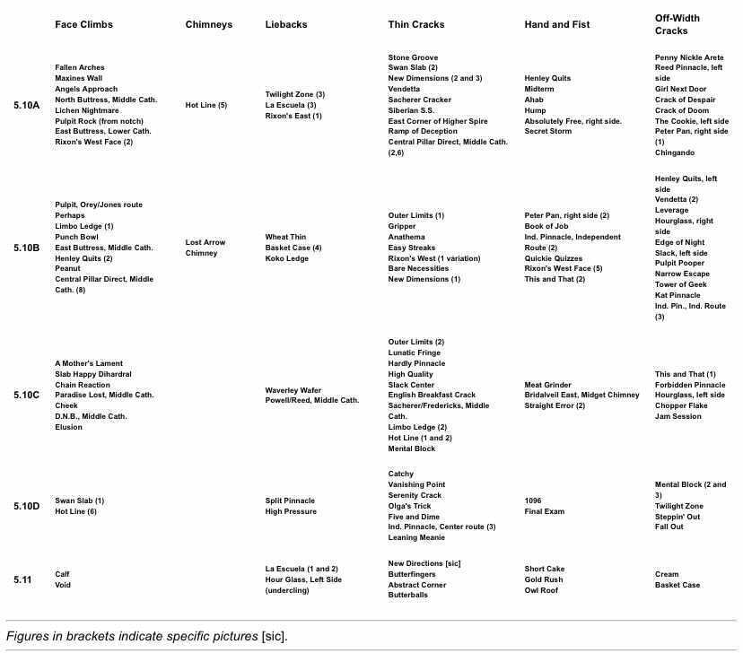 "I've seen 5.11 divided into 11 different grades of increasing difficulty, as follows: 5.11a, 5.10d, 5.11-, 5.11b, 5.11, 5.11c, 5.9 squeeze, 5.11+, 5.10 OW, 5.12a, 5.11d" -Brutus of Wyde Also check out Jim Bridwell's article in which he lays out the a-d aspect of the >5.9 YDS scale. He also makes the important point that grades are fundamentally a communication between climbers, so there's an obligation to be honest and really try to grade in a meaningful way. https://rockandice.com/features/the-innocent-the-ignorant-and-the-insecure-ascent-2/ "Many problems are inherent in any rating system. Rating, itself, is a problem. The different physiology of climbers presents the main difficulty. A smaller or larger, shorter, longer hand-finger-foot-knee-chest-arm-leg-body will make a huge difference in the comparative difficulty of certain moves or pitches. Pitches are listed according to general different sizes, but accurate information about absolute sizes of cracks and other pertinent facts can only be had through word of mouth. Climbing is above all else a human endeavor, and precise communication about it can only pass through those who practice it. Few things are absolute, and rating systems are no exception; but, hopefully, the information given here will help facilitate communication in the climbing community." |