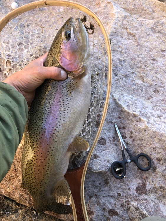 Resurrected from Supertopo, this thread is for climbers that like to fish. Post up your fish pics here! Here's a rainbow my wife Yvonne caught and released while fly fishing at Twin Lakes, Mammoth last summer from her float tube. |