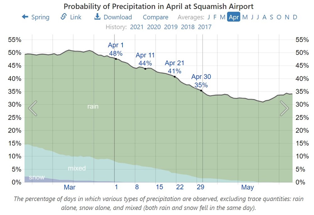 Here's a fun chart...shows the probability of precip in April: We did a trip in May a few years back. Still had rain on probably 1/3 of our week long trip. Part of the issue with April, for me, would be that with colder temperatures, even a list misty rain would take longer to dry from the rock.