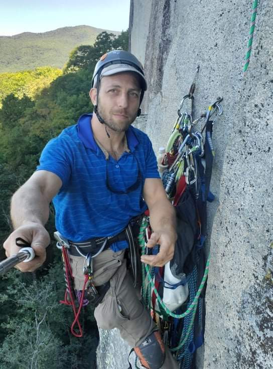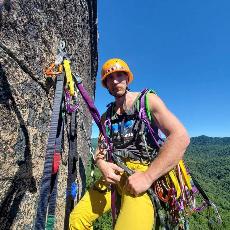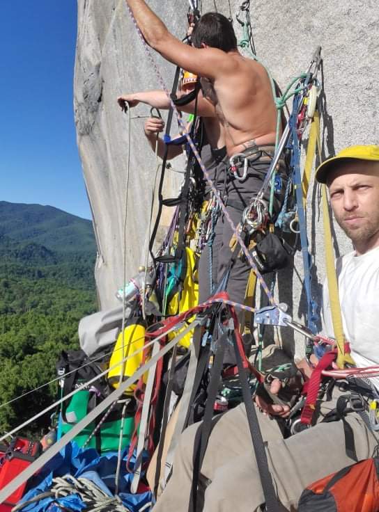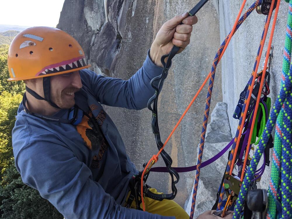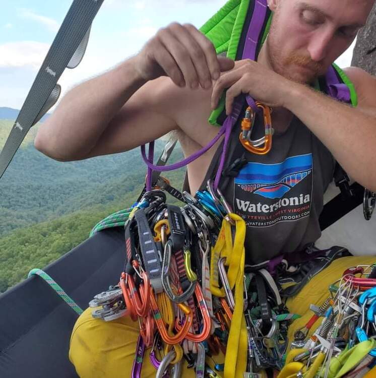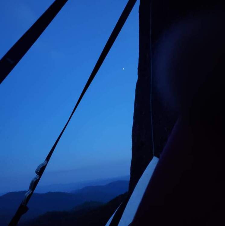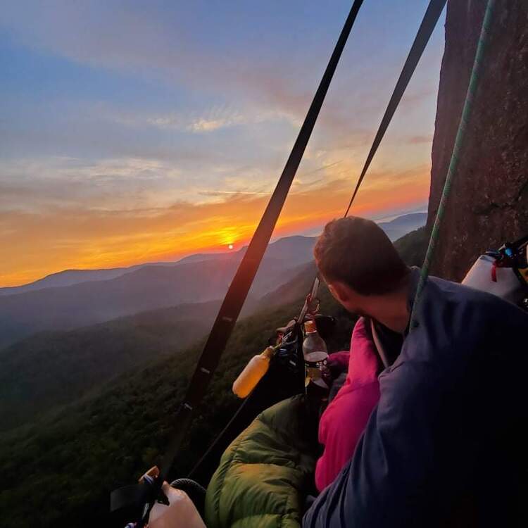 The Backstory My buddy Steve and I have been going to Looking Glass NC for a "little big wall" trip each of the past two years. The first year we went I was pretty new to climbing and had just begun my second year. We managed to get up Glass Menagerie with me leading many of the pitches. I felt quite accomplished considering it was my first time really aiding... and I aided every move. The next year we agreed to attempt Rowins Route. We fix the first two pitches pretty quickly and chill out for the night on the ground. Then the rain starts. We lounge around in camp Squalot (right under Brain Dead A4) getting dripped on for about 3 days. Finally it ends and we jug up the ropes, but as soon as we see the wall above, and the intimidating sea of tiny circle heads, we decide to bail, our morale depleted. Early 2021 we begin talking about going back. I'm starting to look at other routes in the area, and having just listened to an Ed Viestures audiobook, the Scott Fischer Memorial route began to appeal to me. I started getting stoked for the route, and began aquiring the gear necessary to accomplish my new goal. After making a ton of copperheads, getting a Fish portaledge, and all the beaks and peckers I could find on eBay, I figured the only thing that could stop us would be a lack of fortitude. At first Steve didn't seem as jazzed as I, but once we had started he began to understand why I had chosen this route. The Warm Up We hit the road one day in late September on our way to meet our friend Kane at Stone Mountain to wait out a few days of rain. Steve had just acquired a smaller van that we were using, and it was jam-packed with gear. After hanging out with Kane, all three of us decide that it is time to head to the north side of Looking Glass. Kane and I immediately hike in after arriving and start working on Rowins. I finish the first pitch in the dark, and in the morning Kane cleans it. I then ascend the rope and start hauling an outrageous amount of stuff. For some reason the bags were probably like 250 lbs! We had just thrown in all the water and food we had, a large rack, 3 people's gear, 2 ledges, etc. Likely enough to last 3 people 5 days. After trying to pull the bags up in vain, I end up using a 2:1 and also use Kane as a counter weight. Apparently Steve wasn't planning on joining our attempt, so the fact that we hauled that much stuff was slightly frustrating, although now pretty funny. Kane led the second pitch, doing a very good job considering the little heads and huge reaches between rivets on the overhanging wall, and not to mention he had a groin injury...After reaching the belay with his groin in pain and probably feeling frustrated he pulls up the spare lead line on the tag line, and raps down to Earth. I then also rap down, from the top of the first pitch. We chill out with Steve, having pretty much already decided to throw in the towel. The gear was too heavy, the route too hard, we brought too much shit, we were too slow. All these thoughts were already nagging us. Kane and I decided we would go back up and at least spend a night in our ledges and I would clean the next pitch while he lowers our camp to the ground. The next morning I refill my Olde English bottle, only this time with piss and try to pour it away from the rock. Then we hear Steve yell up "what is that, what are you doing?" And in response Kane yells down that it's my piss. We both giggle. I suppose Steve felt renewed, as he jumared up the fixed ropes to join us one the ledge. In his hand he held the second lead rope that Kane had fixed and single strand rapped the day before. He came up with an idea of doing a huge rope swing off the ledge. The rock above is pretty steep and overhanging, so you really swing out into space. Steve and Kane both go for a few swings, hooting and hollering and making TikTok videos while I begin cleaning pitch 2. We all meet on the ground and then do some easy trad the rest of the day. We help Kane hike out his gear that night. The next day I'm ready to leave the north side, as I've lost motivation, but Steve really wants to get on the wall. He knows I want to do the Scott Fischer Memorial, and manages to bring back my stoke. We take our time to prepare. Resting, reading, eating, etc. Steve is a pretty good camp chef. We finish sorting through the gear for the route and I hike into sleep at the base at "camp Squalot". Steve will meet me in the morning. And so it begins.. Scott Fischer Memorial Route : part one It's now morning, a little chilly, but once we are in the sun on the wall we'll be warm. Steve has showed up with a cooler full of egg, onion, and kielbasa sandwiches. We eat a light breakfast and I convince him to lead the first pitch. He sets off, setting mostly trick nuts and occasionally pulling on a fixed pin. The line isn't exactly obvious, and he has to do a few hook moves every now and then. After perhaps 2 hours he reaches the belay. He fixes the rope and returns to the ground as I begin ascending and cleaning the pitch. As I get closer to the belay I realize that Steve's pitch was actually pretty tricky. Some slick nut placements seem to be holding by magic. And there were hook moves into invisible bat holes filled with dirt. Pretty glad I didn't have to lead it, and was stoked that he had such a solid lead. After cleaning I join Steve on the ground and he offers me a sandwich, which disappears quickly. We then go back to our respective camp sites and lounge around the rest of the day. He in his van, and me at "camp Squalot" The next features on this route are called "synapse ramp" and "slot of delight". Pitch 2 starts with a few rivets and heads, then nailing beaks up a shallow ramp, and squeezing up an offwidth that usually wouldn't be too bad, if not for the mounds of equipment slung from my hips and shoulders. Squirming up I make a few hook moves, then sling a horn, and step over to the belay. Steve starts working across, only to be stymied by the removal 