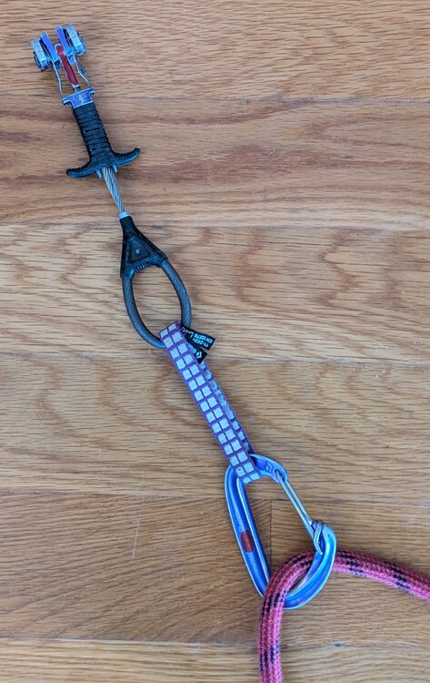 There were two bolts 5 feet over from the climb we wanted. I did not want to take a swing. I used a quad for the anchor, and a cam with a shoulder sling clipped to the rope for a directional. In order left to right (as you read this) cam in a horizontal crack with a shoulder length sling, rope over the route, quad anchor. The carabiner on the redirects rope end got pretty banged up on the rock from scraping, and it bound up on the rock, which at times made it hard to take in slack. It also twisted the rope a decent bit, I presume because the directional was same height as the anchor, and it got pinched against the rock. Perhaps these would have been less problematic if we didn't hang dog the route so much? What do you all consider when putting in a directional? Do you try to keep the directional below your anchor, do you shorten the sling to avoid any pinches, is it better to try and make the carabiner free floating? I think I could have shortened it up in hindsight. The top of the route had a spacious gap the rope could have sat in from the redirect. Are there time's where it's just going to be shitty? |