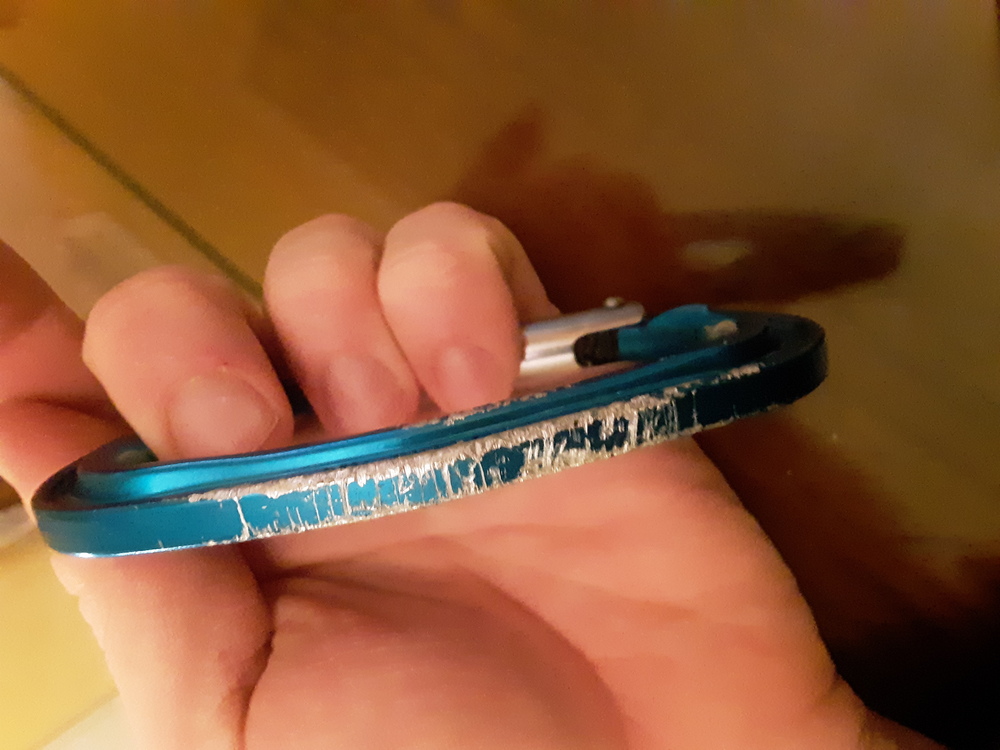 Austin Donisanwrote: I'm not sure I have the right words to describe the rock features. Basically, the horizontal crack I placed the redirect cam in was off to the left, and set back a bit. So that's why I extended, to avoid rope drag on another rock. But, reading all this, I probably extended too much. How much will the carabiner get beat up in those pictures? What will the three ovals help with on slab exactly? Thanks for the pictures, I hope to use them next time. They make a lot of sense. (this is the beating my carabiner took, just for a visual. |