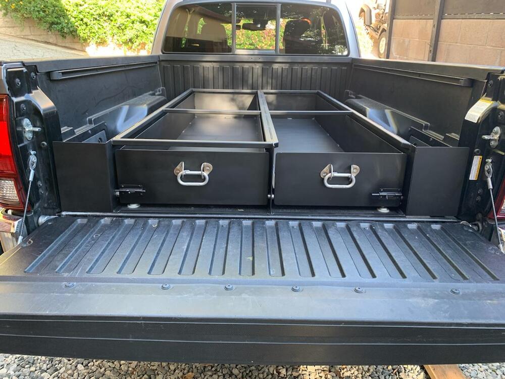 Here is mine. I designed it and a friend built it for me. Before the deck was put on. The right drawer has a cut out side to make it easy to put a cooler in and to cook on my stove when camping. The deck there is separate so I can have it off to hold a tall cooler when traveling. Camper shell is on at this point and will get solar soon so that I can add a battery in the back and carry an electic cooler instead. |