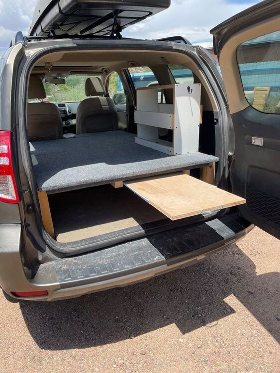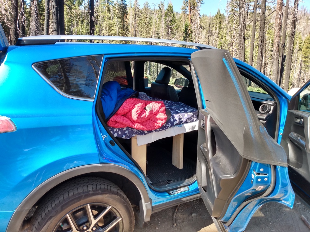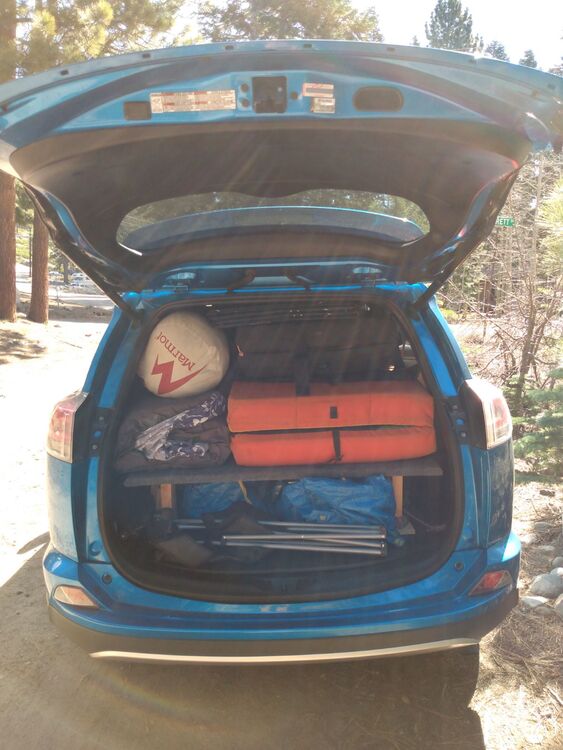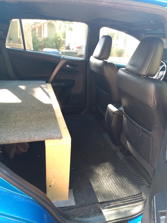 Old setup was a 2007 Outback. No build needed, just put down the seats and roll out the pad and sleep. Sold that car this winter after finally giving up on the constant mechanical issues. New setup is 2016 RAV4 with the rear seats removed. Solid amount of storage space in there once you remove the seats. Two part sleeping platform. The main platform stays in permanently and functions also as a storage shelf (1st two photos). 46 inches long by 43 inches wide, carpeted. This is it is driving/storage mode: To go to sleep mode, slide the seats all the way forward and put in the second panel (26 inches long by 43 inches wide). Attaches in to the lip of the main platform using drop pins, and then there's two legs for the front side that also attach with drop pins. Takes about 2 minutes to set up. Creates a 72 inch long by 43 inch wide platform that comfortably sleeps two people. Exped pad goes on top, is same size as platform. Lots of storage space under the platform to leave the cooler and bags in the car overnight. The big crash pads don't fit in the car while sleeping. With the second panel up and the screens on: Not as big and spacious as a van or truck, but offers a lot given the size of the vehicle. Good compromise between needs of city life and also serving as weekend sleeping module. Overall an upgrade from the Outback. |