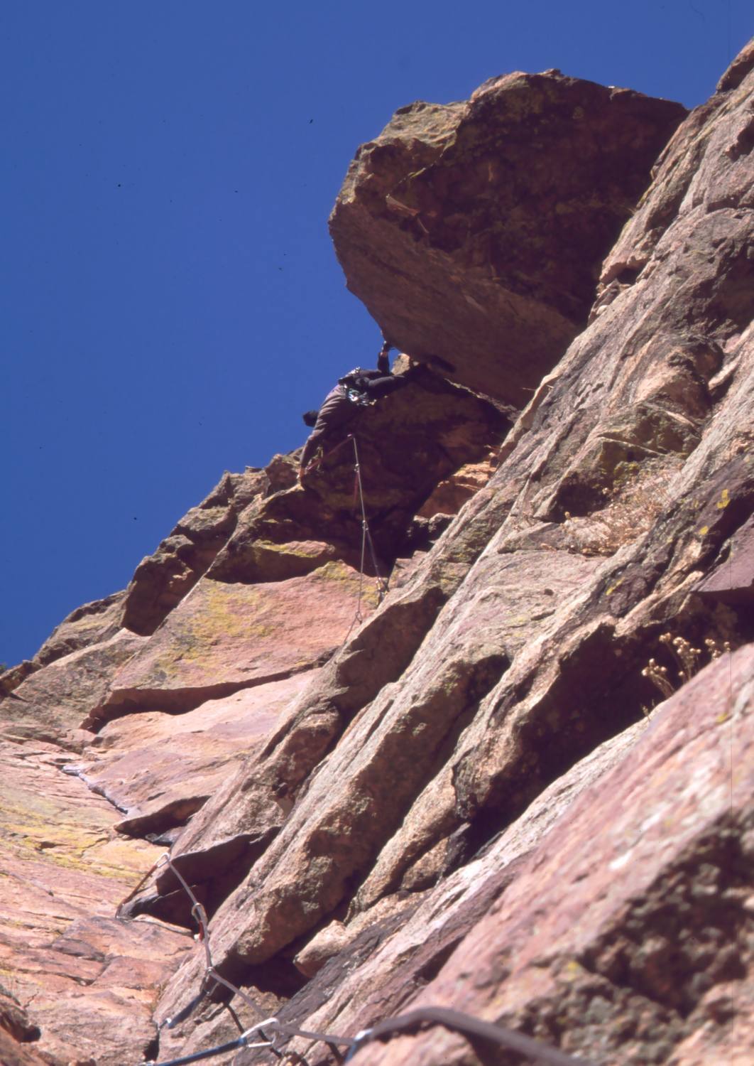 “Tony Bubb sews it up on the RastaMan Roof variation (5.9+) of Reggae, on the Wind Tower of Eldo. Photo by Joseffa Meir, 2002.”