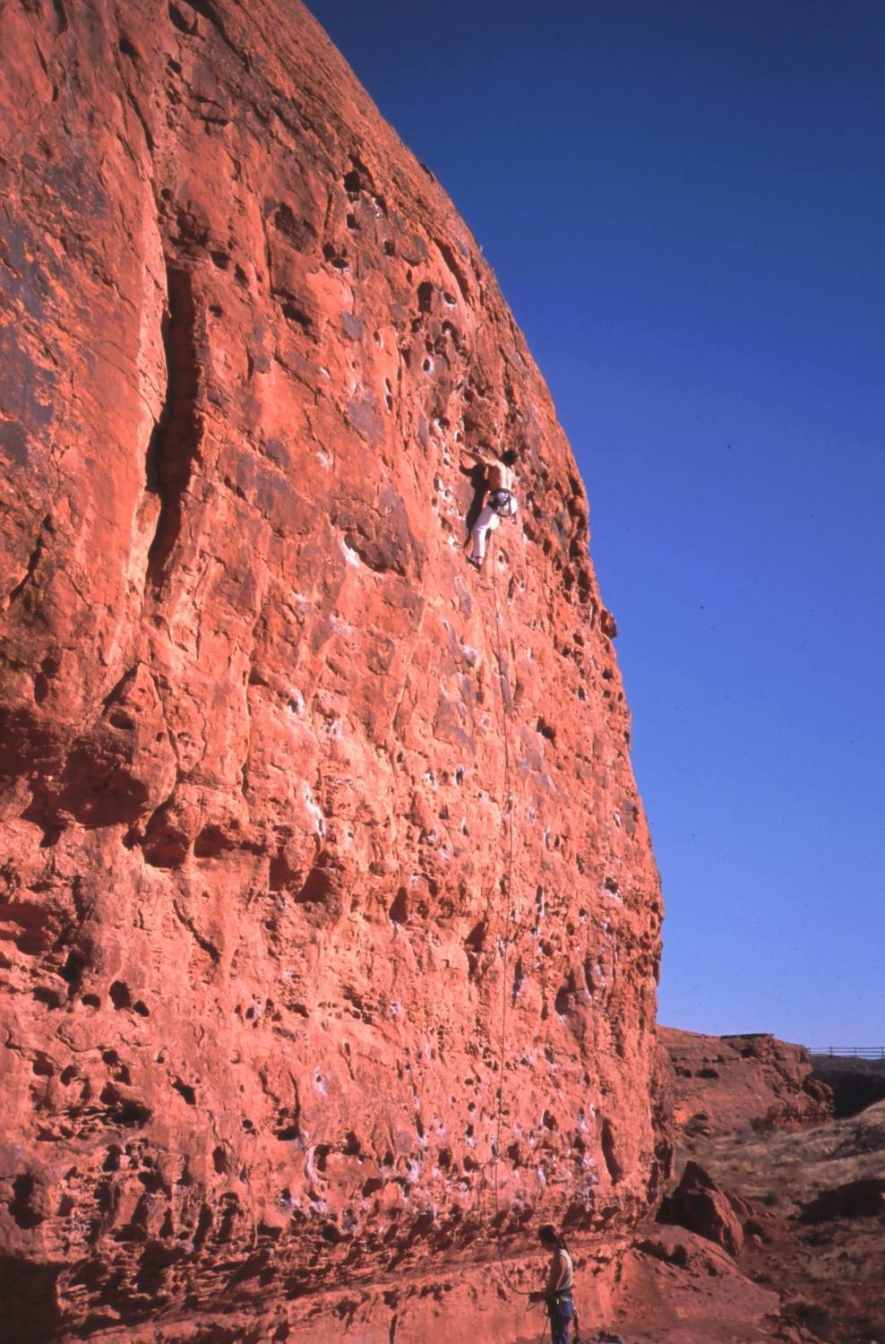 “Tony Bubb leads 'Dirtbag' (10b) at Chuckawalla Wall, in St. George, UT. Joseffa Meir belays. Photo by unknown stranger.”