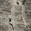 “Finishing the first pitch. Note the anchor up high in the crack, rather than the flake.”