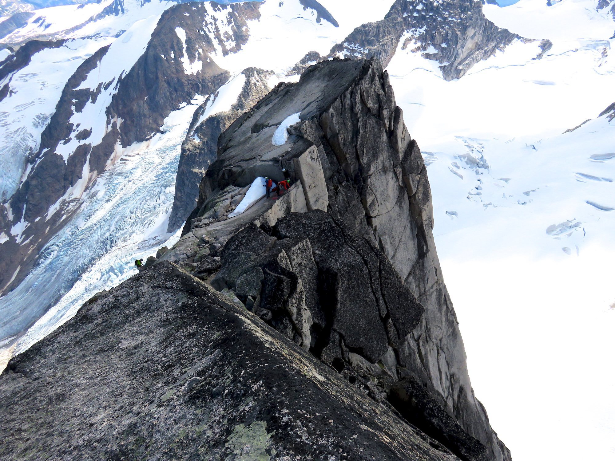 “The three climbers in the photo are at the rap station at the start of the Krause-McCarthy Rappel Route. The climber on the left is coming up from the Snowpatch Route. All routes that react the South summit desced via the Krause-McCarthy Rappel Route. The guidebook says you need two ropes, but you can also rap it with a single 70m rope (the party after us did). Not sure if a single 60m rope would work. We made four double-rope rappels. We got our rope stuck (twice!) on the third rappel and the party above us freed it (twice!). The rappel route dumps you off ~100m of scrambling from the base of Surf's Up, so we were able to leave our approach shoes and ice axes at the base of the route and not bring them up the climb.”