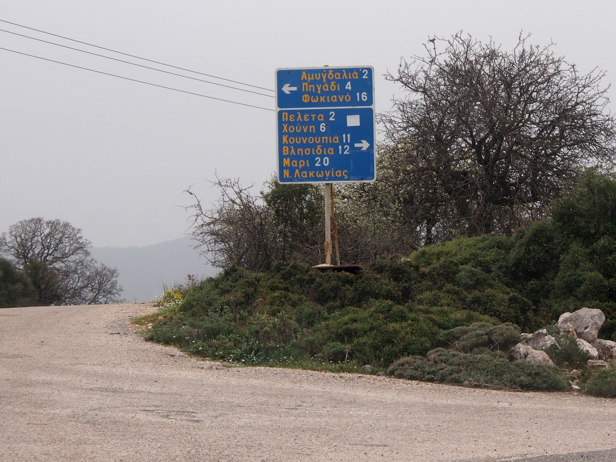 “Road Sign at the "Y" intersection -go Left. The bottom name, at 16km, is "Lakonias" (or Fokianos" )”