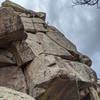 “One of the many trad lines at the foreplay wall. All have bolted anchors at the top visible from the ground.”