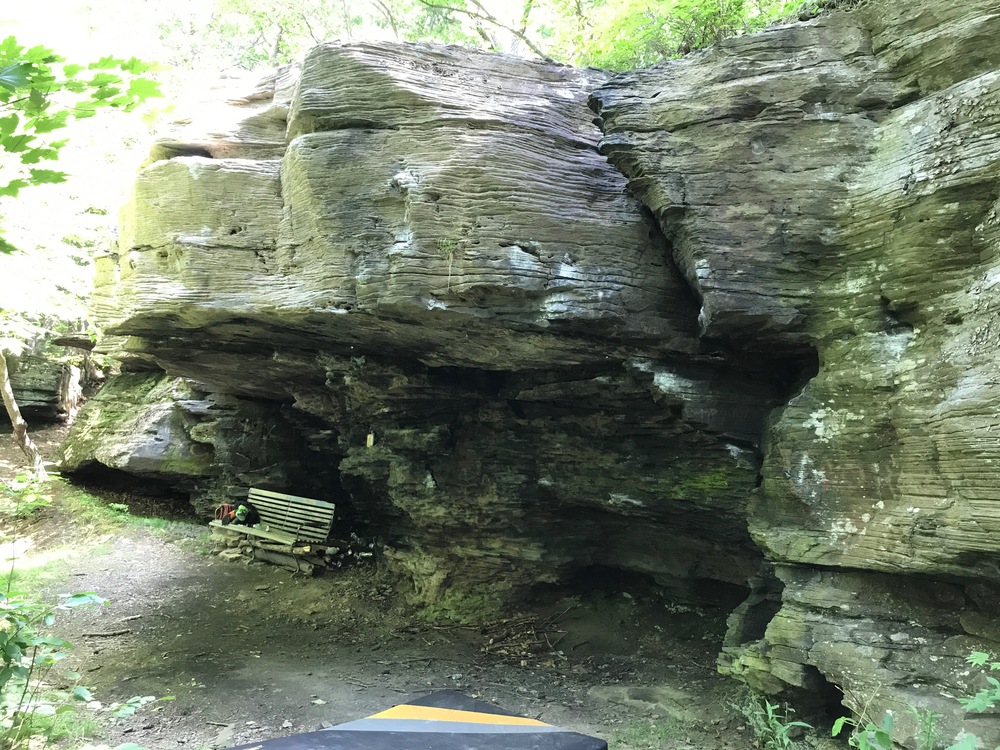 This route begins on the furthest side on a large ledge and moves from left to right (while facing the cliff) with feet on the left wall. the route then moves into the crack, down to a large jug, then a match on a large sloper. After that, the route moves across the inner facing of the cave on a number of crimpers and ledges. The route continues moving right to the point where the bottom becomes carved out. This section requires moving hands far off to the right while throwing a heel hook high to the left. Hands then move onto a thin crack/crimper ledge. Legs let go and swing off to the right where they sit on solid holds. This is the beginning of the crux section of the climb. The route continues right and then goes up on to the face of the cliff onto a number of pockets. The pockets run vertically up the cliff to a horizontal sloper section. The hardest part requires moving feet up while hands are in the deep sloper and then ends with a very difficult top out. -barrett1824 on 2010-05-13 rockclimbing.com