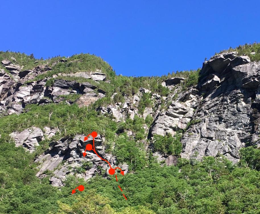 P1. Start left of the Quartz Crack Face, left of the gully that leads up to Skywalk (.10b) at a crack system with a lone bolt up high. Climb the crack being cautious of loose rock on the right and clip the bolt to pull up and over to a bolted anchor station. ~ 50’ , 5.8+