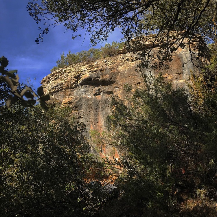 Continue walking straight past Bloque A (home to La Esconbrera, Mamba Negra, etc.), into increasingly trail-less terrain. Just keep hugging the side of the rock band and you will eventually come to an unmistakeable boulder. This is Atonement. Maybe 5-10 minutes past Bloque A? Kind of a heinous approach for the time being.