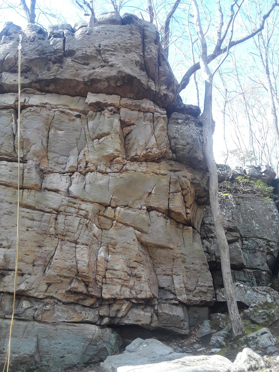 Overhang is a really nice climb that wears out your arms really fast. There are multiple ways to get over the overhang. If you are new to this route, having a spotter may be helpful. This will ensure that if you fall off the wall, you will not swing into your belayer or hit the ground. Many holds at the beginning are heavily chalked and show the easiest way to go. Depending on the way you go, there is a traverse from the left to right underneath the overhang and it is key to make sure you don't get your feet too high. At the top, there are two main ways to go, straight up or to the right.