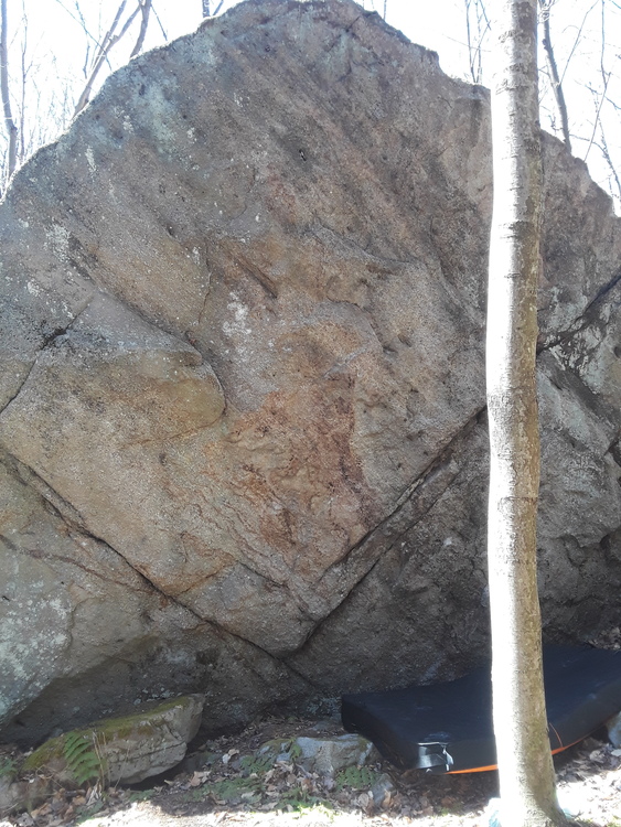 This rock can have multiple paths from the right or left; however, this route goes directly up the center. Start with both hands on a small ledge in the bottom crack. It helps to hold onto the crack if you do a bicycle with your feet. Powerful move to a right hand crimp. Move left hand to a small under cling, then bump up to a small crimp. Move right hand to a small ledge and move left hand to a really bad side pull. From here you have to dyno to the top because there are no holds in between.