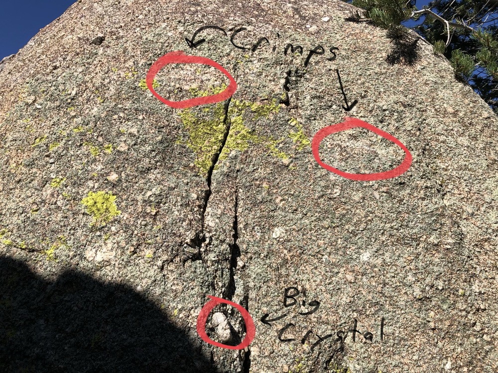 None of the non-Crystal Ship holds were chalked when I did this problem, however the big crystal just screams “hold me!” so I find it hard to believe that no one had previously climbed this line. If so, please amend in the comments. After all, I only recently started climbing here thanks to COVID (thus the name).